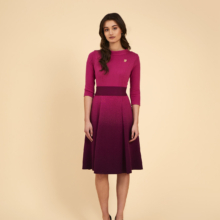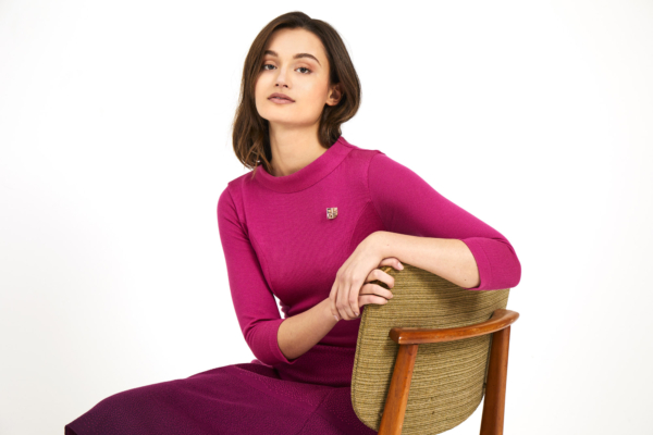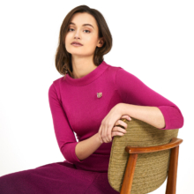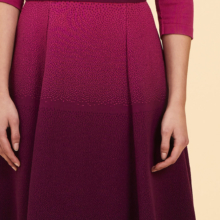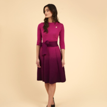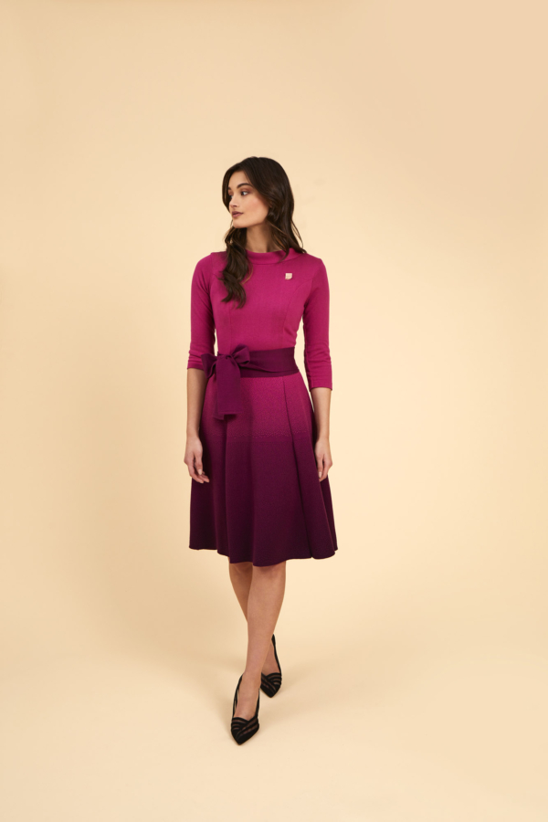 Is this dress dip dyed or is it a shade? If you look closely, you can see that Aya flared dress has all kinds of small knitting stitches that make the ‘shocking pink’ dress overflow in colour ‘vino’. A beautiful optical effect. The body has a nice fit because of the darts and the elegant collar. The skirt has a beautiful drape because of the knitted color gradient. The body is thinner and single knit, so it is ideal to wear all year round. The sash is included.