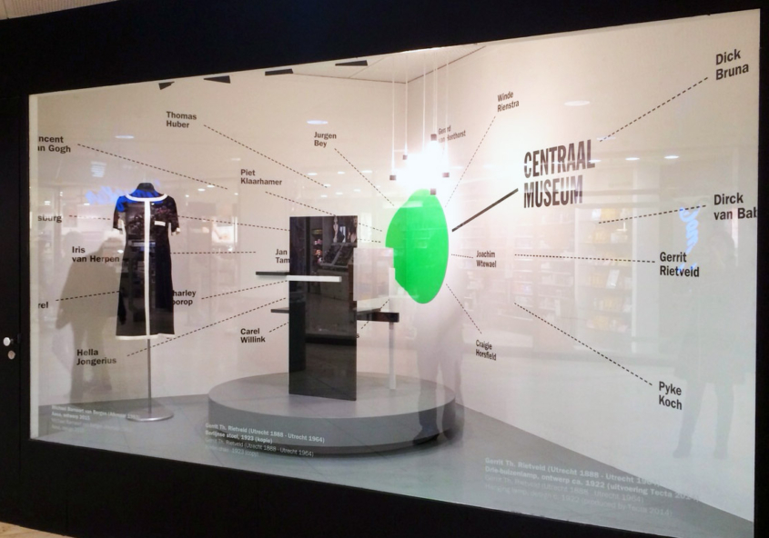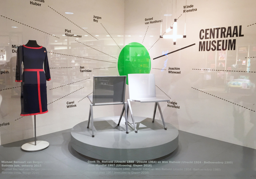 La robe Bathilda ainsi que la chaise Mondial de Gerrit Th. Rietveld (1888-1964) et de son fils Wim Rietveld (1924-1985) sont exposées dans la vitrine du Centraal Museum Utrecht sur Hoog Catharijne.