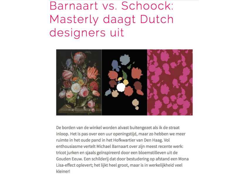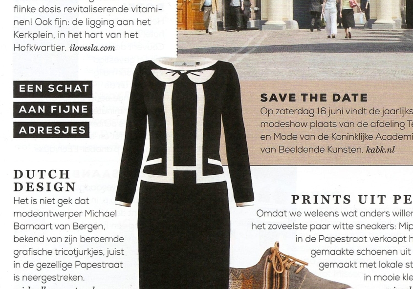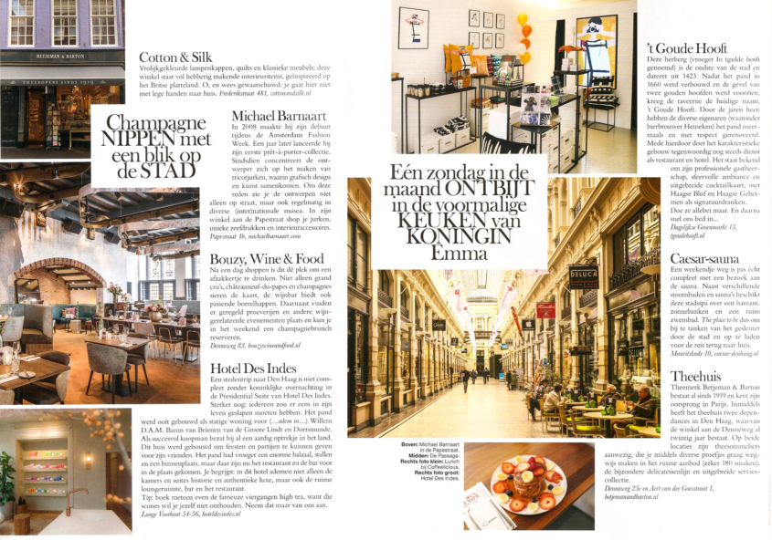 Anita Willemars tipt Michael Barnaart+ in Nouveau magazine: “Nieuw Haags. Michael Barnaart ontwikkelde de afgelopen jaren een geheel eigen stijl in modecollecties. Zijn grafische jurken zijn beroemd. Het idee voor Michael Barnaart+ ontstond in samenwerking met diverse musea, waarvoor hij veel meer dan jurken ontwierp. De winkel biedt o.a. (design-)woonaccessoires en mannenkleding. Michael Barnaart+, Papestraat…