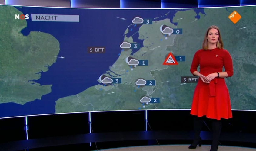 Weervrouw Willemijn Hoebert draagt jurk Cologne in NOS Achtuurjournaal (NOS, NPO1).