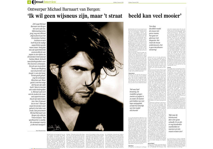 “Practical without being prosaic. Are we growing up or is fashion becoming more sensible? Michael Barnaart van Bergen’s new collection L’Hiver Brûlant delivers sensible, flattering and elegant pieces in bold colours (gasp) without a hint of the other ‘b’ word – boring that is.” (Design.nl)