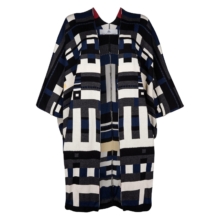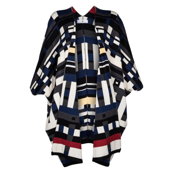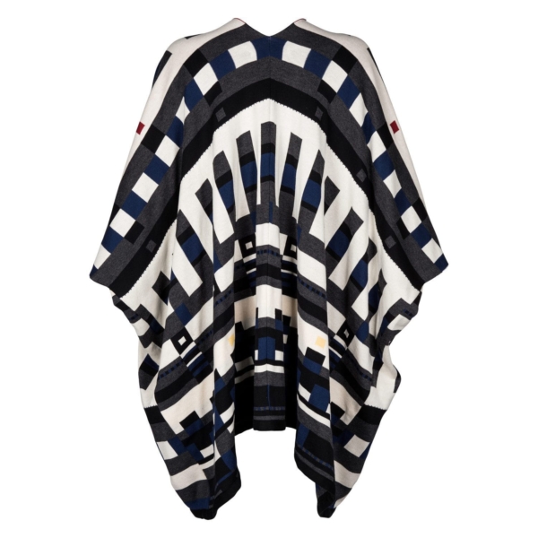 De poncho kun je royaal over elke outfit dragen. Het jacquarddessin is in de stof gebreid, waardoor aan de binnenzijde een diapositief van het patroon zichtbaar is. De poncho met armgaten is mooi van eenvoud en heeft geen sluiting of zakken. One size fits all.