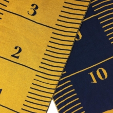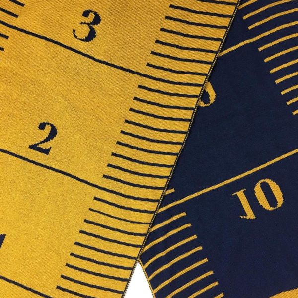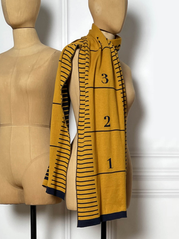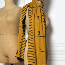 Een fijne brede sjaal met een grafisch dessin van een meetlint. De sjaal is aan twee kanten te dragen, de achterkant is diapositief.
