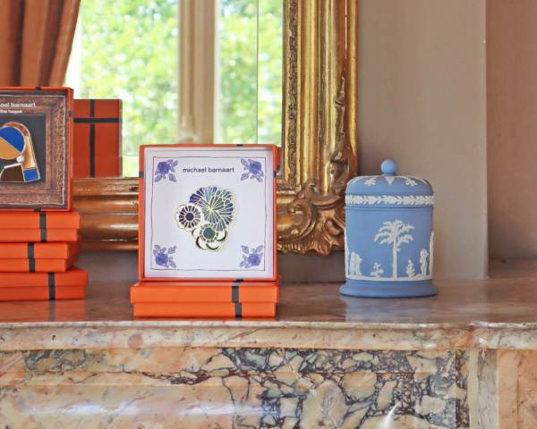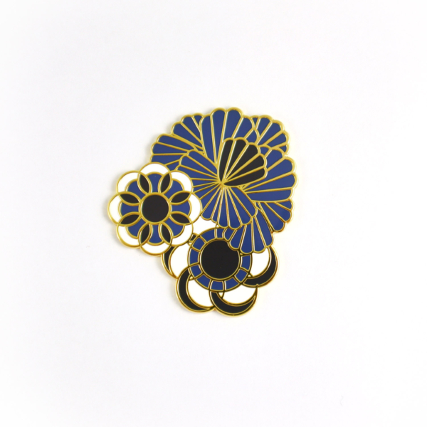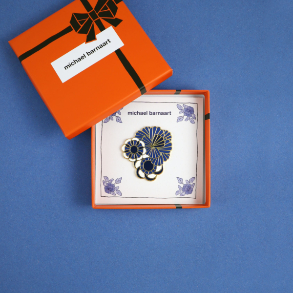 Dit ontwerp is geïnspireerd op Delfts blauw uit diverse Nederlandse museumcollecties. Delfts aardewerk is niet alleen een prachtig ambachtelijk product en een symbool van de Nederlandse cultuur, maar het vormt ook een bron van inspiratie voor modern design. Deze broche is geïnspireerd op de bloemschilderingen van Delfts blauwe vazen en schotels. Hoewel de vormen geometrisch zijn, brengt de lijnvoering de dynamiek van verfstreken tot uitdrukking.