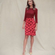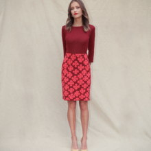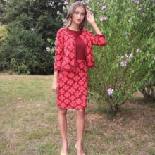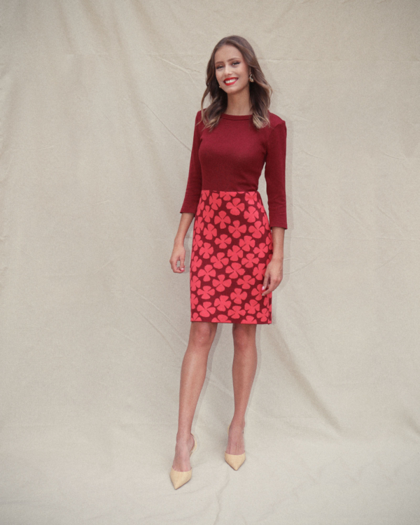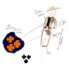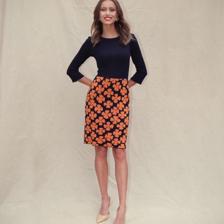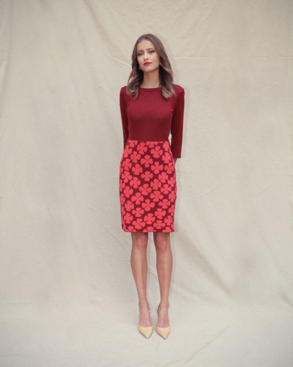 De goudpapaver vormt het uitgangspunt voor dit ontwerp. De bloem is grafisch en frêle tegelijk. Dat inspireerde Michael Barnaart tot het tekenen van een nieuw dessin op basis waarvan hij deze elegante kokerjurk ontwierp. Dit ontwerp is volledig in Nederland vervaardigd.