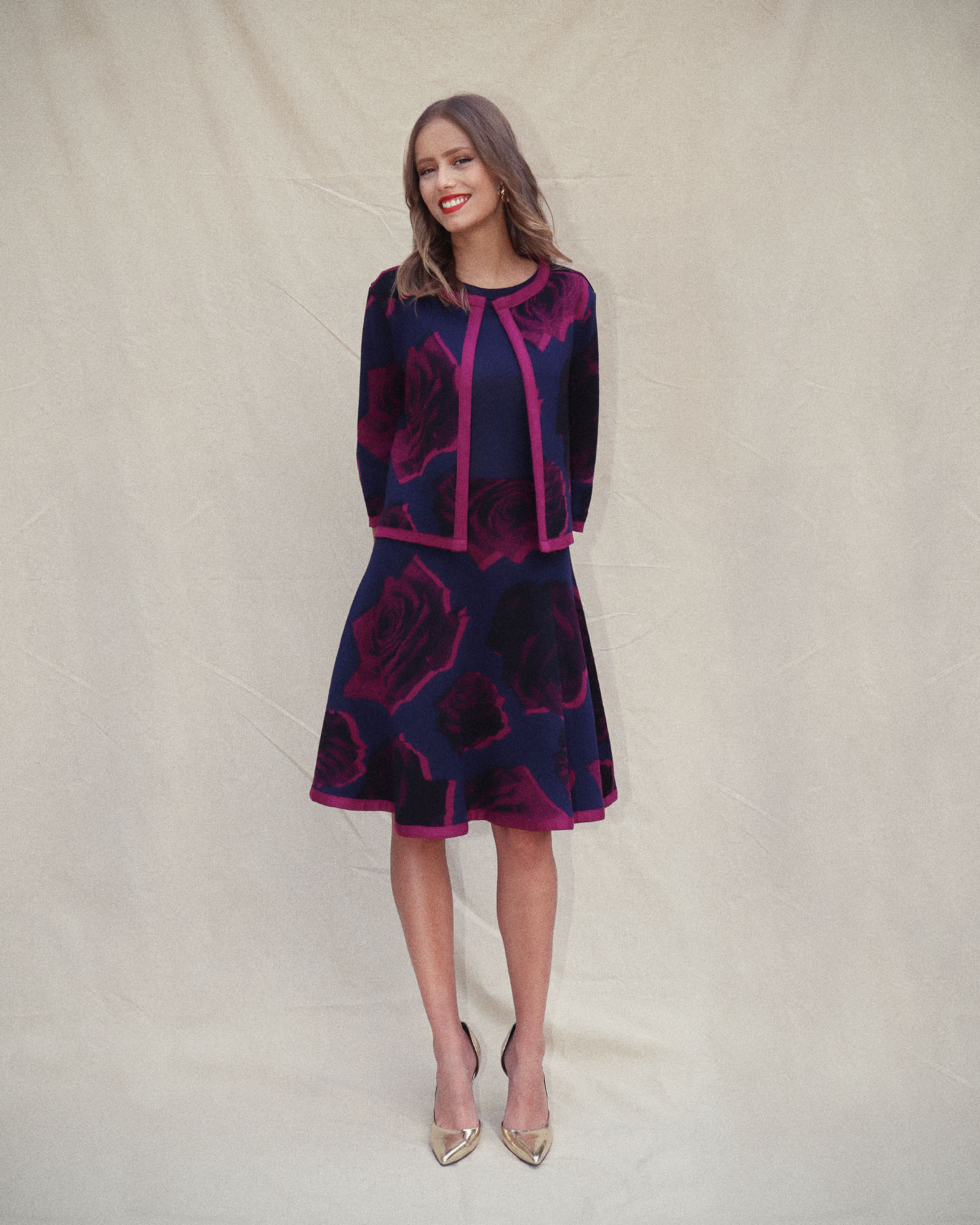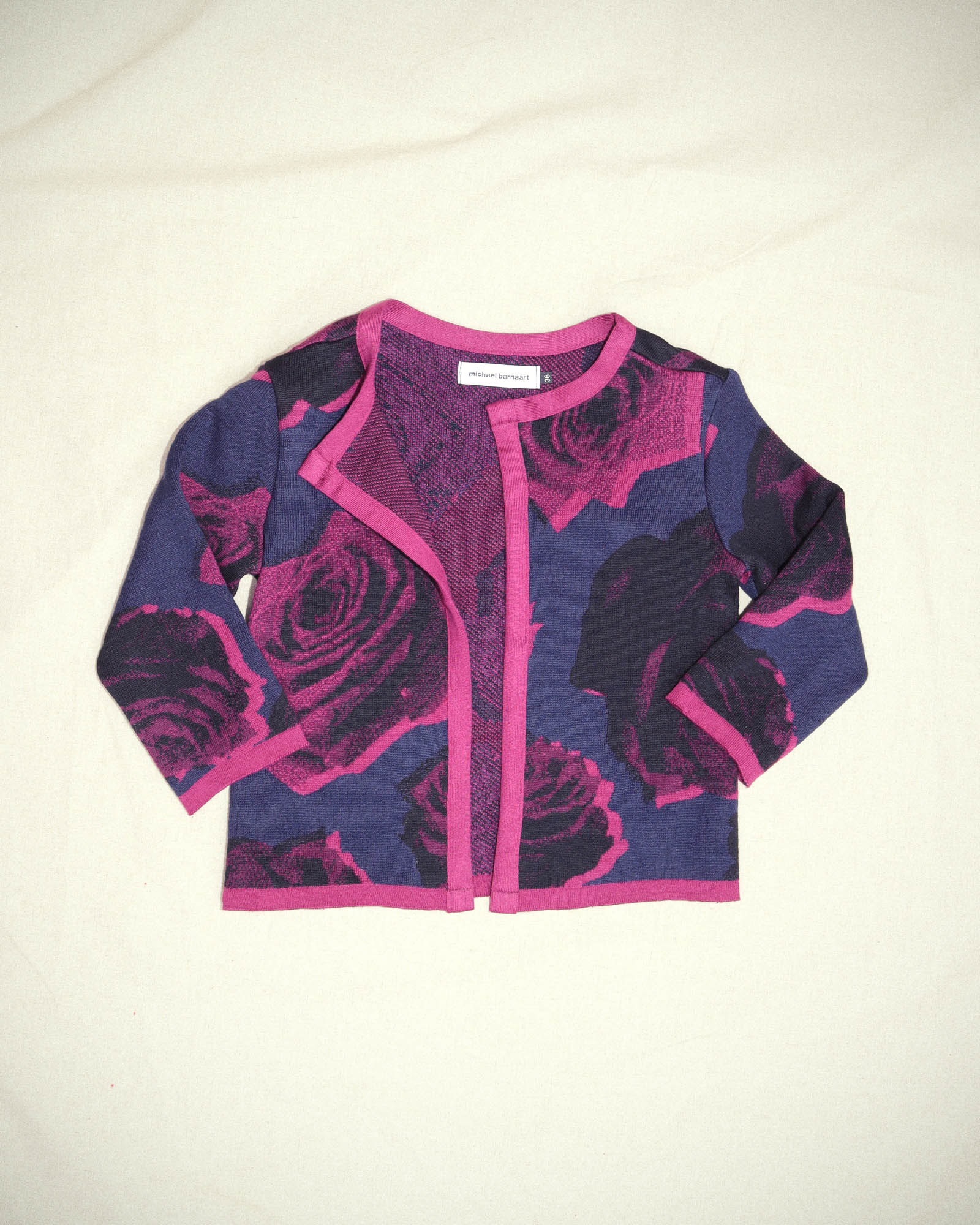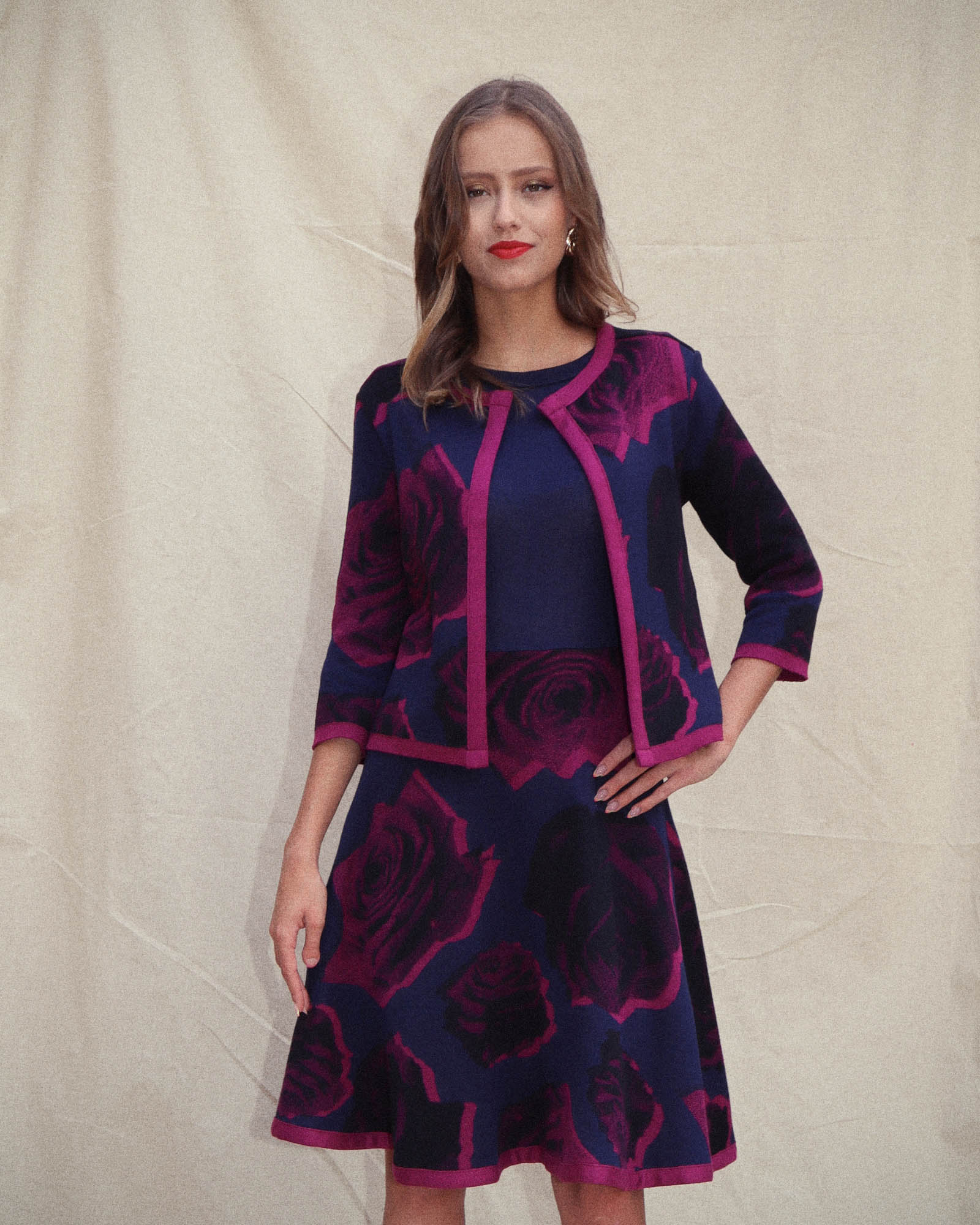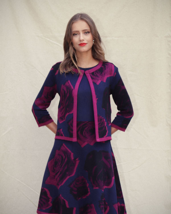 Jasje Liliosa met een ingebreid rozenmotief, waarin foto’s van rozen zijn omgezet in een uniek breipatroon: een prachtige combinatie van klassiek én modern! De kleuren zijn diep donkerblauw, framboos, zwart en wijnrood. De stof is mooi stevig gebreid (vier kleurlagen), waardoor hij prachtig zwaar en soepel valt. Het vestje heeft driekwart mouwen, geen sluiting of zakken.