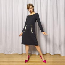 Aan de voor- en achterzijde van deze knitwearjurk zijn de f-sleutels in de stof gebreid. De jurk met trapezelijn (A-lijn) is passend bij de schouders en loopt wijder uit. De kleur is zwart met crème. Deze little black dress is een echte klassieker én een ‘conversation piece’!