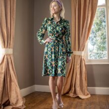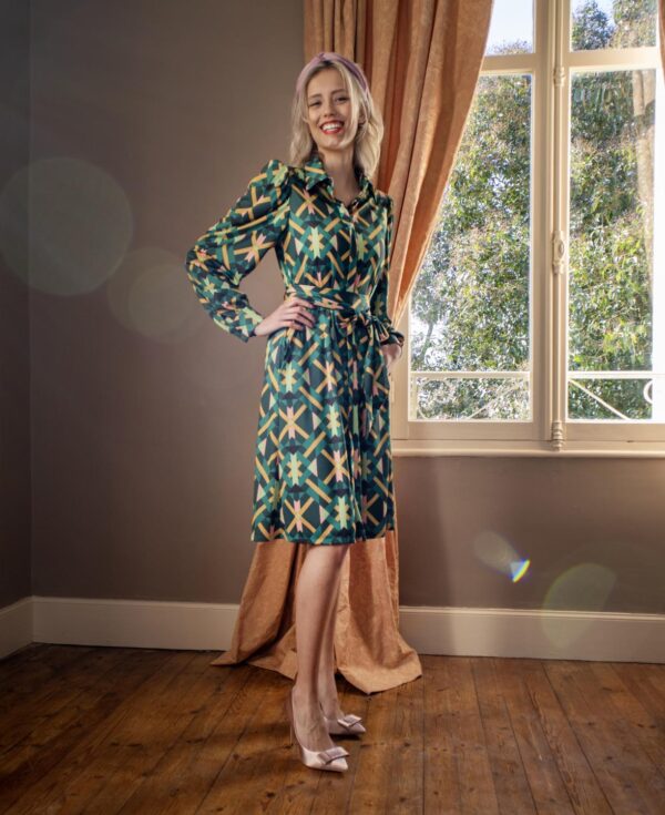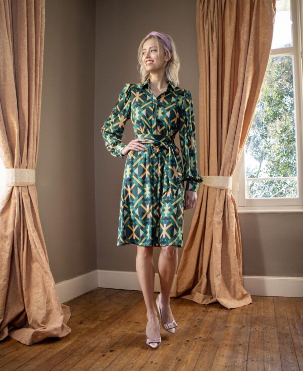 Blousejurk Margaux heeft een klokkend silhouet, een blinde knoopsluiting en zakken in de zijnaad. Het motief is een weefsel van geometrische vormen in levendige kleuren voor een vrolijk effect. Dit ontwerp valt losjes om je lichaam en kun je tailleren met het bijgeleverde taillelint. Door de lichte stof en het luchtige silhouet is deze jurk ideaal voor zomerse dagen en zwoele avonden. Deze jurk heeft de kwaliteiten van travelstof (comfortabel, rekbaar, niet kreukend, makkelijk wasbaar en sneldrogend), maar dan ook nog eens duurzaam gemaakt van petflessen!