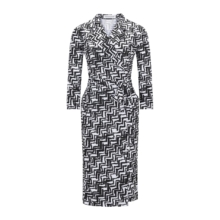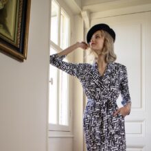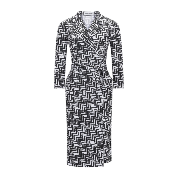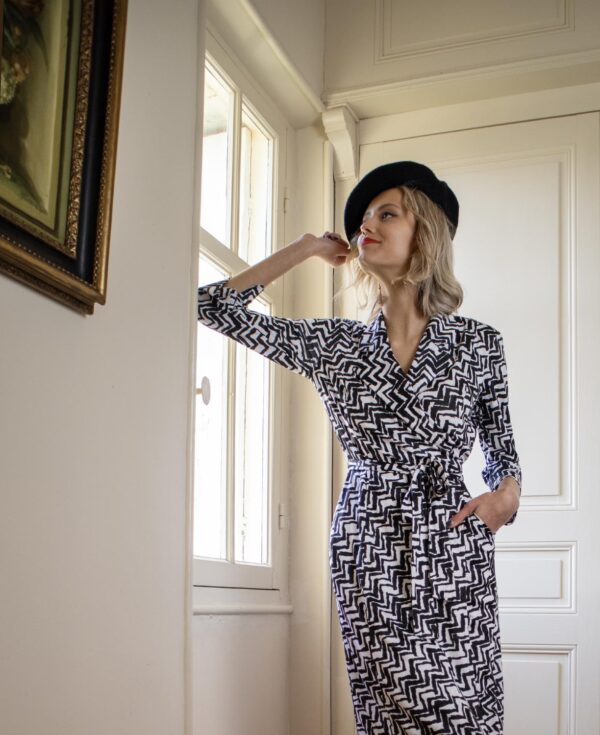 Voor deze wikkeljurk heeft Michael Barnaart een print ontworpen die een combinatie is tussen gestructureerde geometrie en een organische dierenprint. Het silhouet en de levendigheid van deze grafische print doen ook aan de jaren 70 denken. Wikkeljurk Renarde heeft brede revers, elegante driekwart mouwen (met splitje zodat je ze kunt omslaan) en zakken in de zijnaad. De wikkeljurk is zwart-wit en daarom moeiteloos te combineren met andere kleuren. De stof heeft de kwaliteiten van travelstof (comfortabel, rekbaar, niet kreukend, makkelijk wasbaar en sneldrogend), maar dan ook nog eens duurzaam gemaakt van petflessen. Dit ontwerp is eenmalig en in beperkte oplage gemaakt.