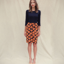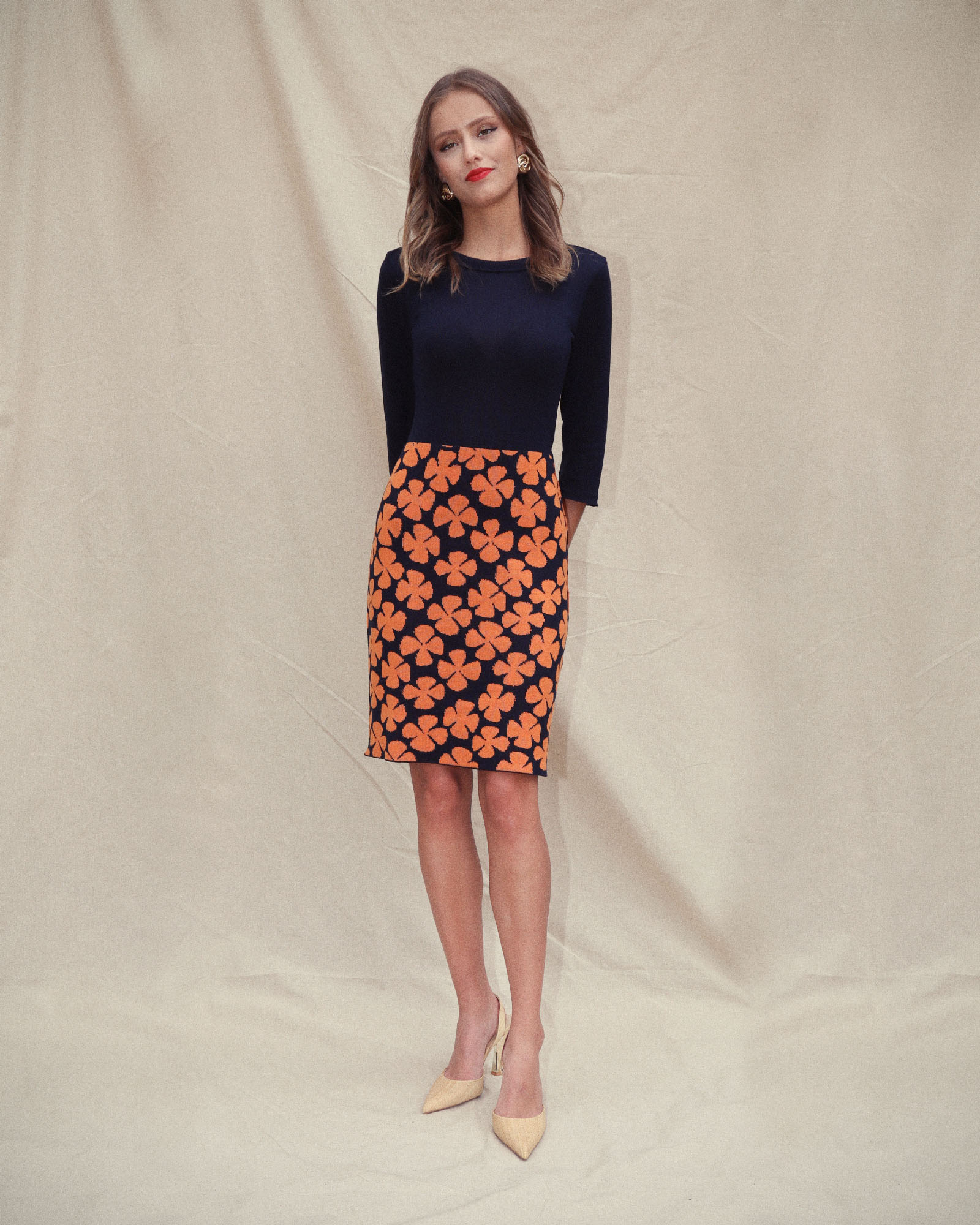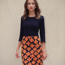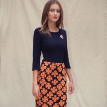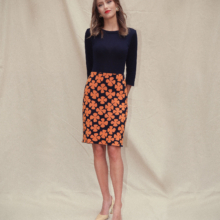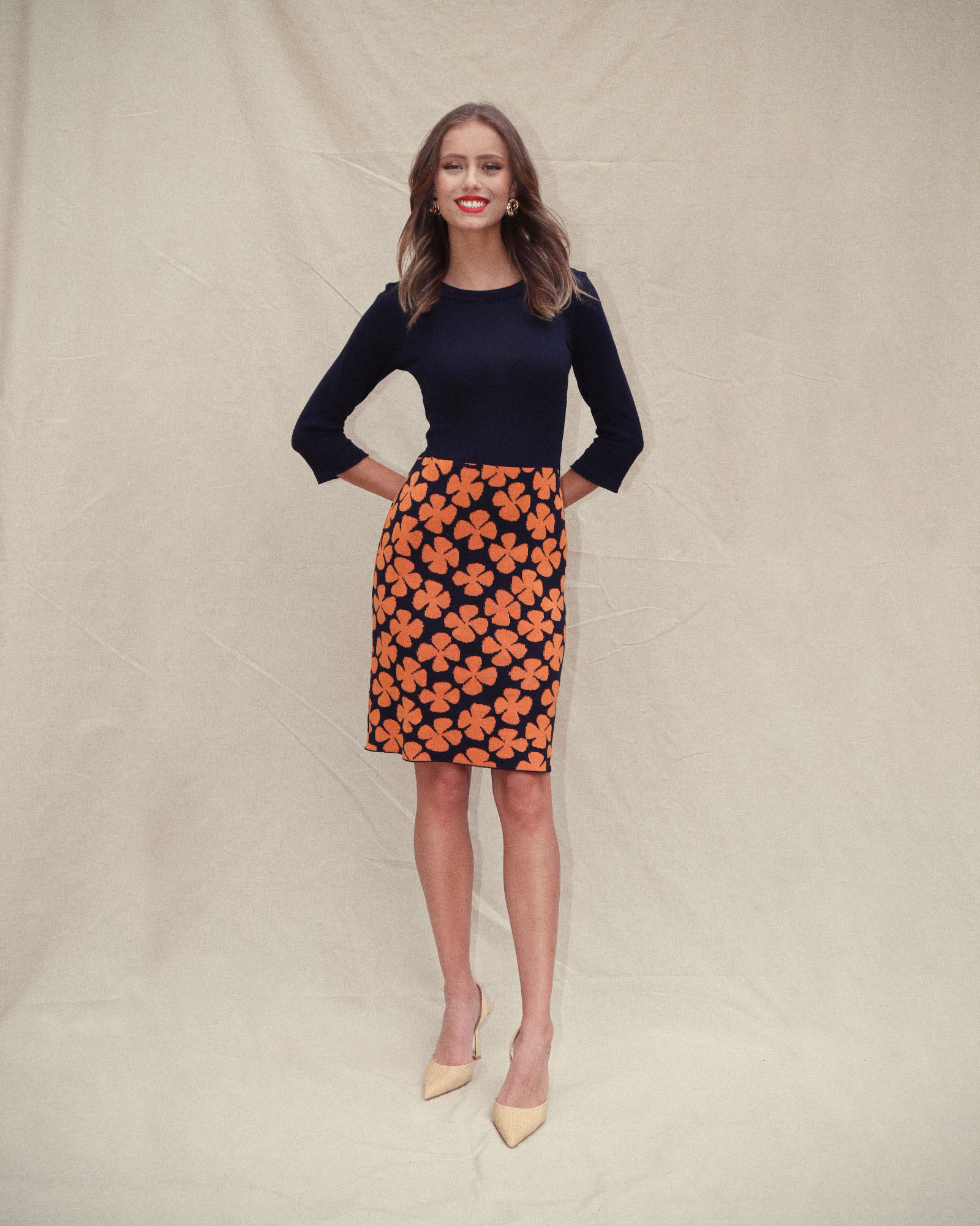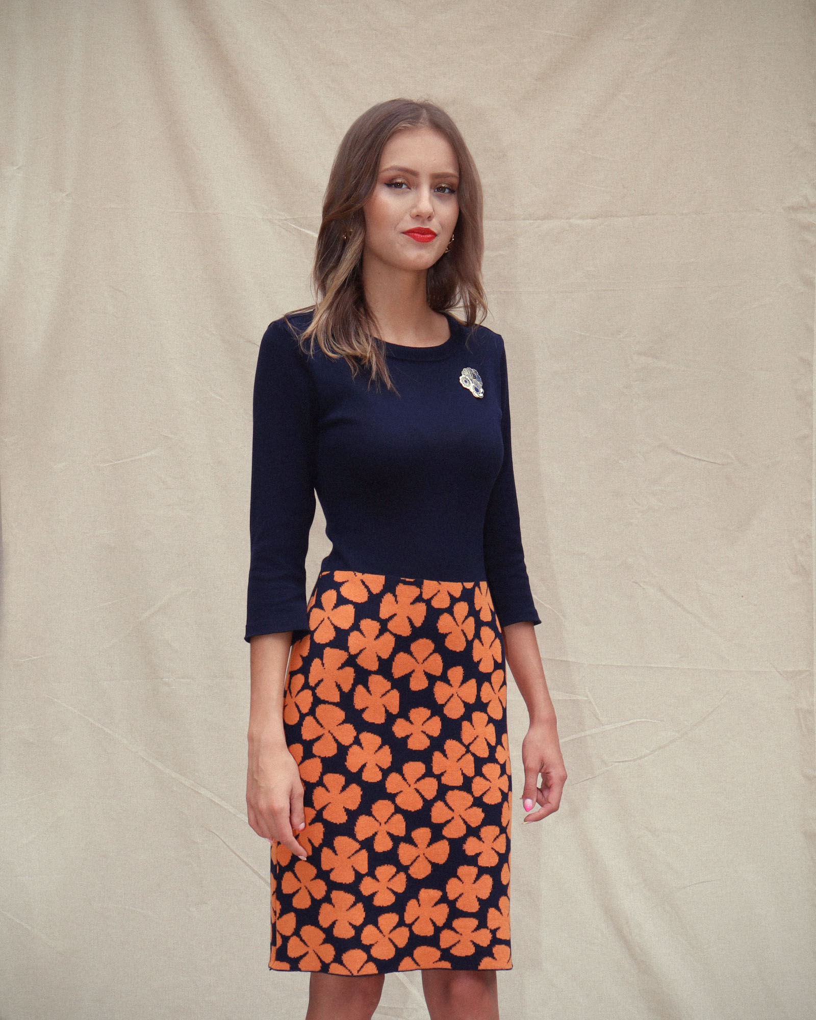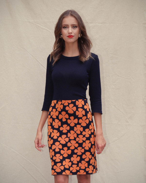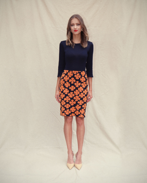 De goudpapaver vormt het uitgangspunt voor dit ontwerp. De bloem is grafisch en frêle tegelijk. Dat inspireerde Michael Barnaart tot het tekenen van een nieuw dessin op basis waarvan hij deze elegante kokerjurk ontwierp. Dit ontwerp is volledig in Nederland vervaardigd.