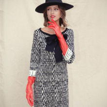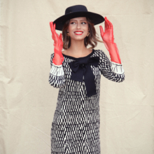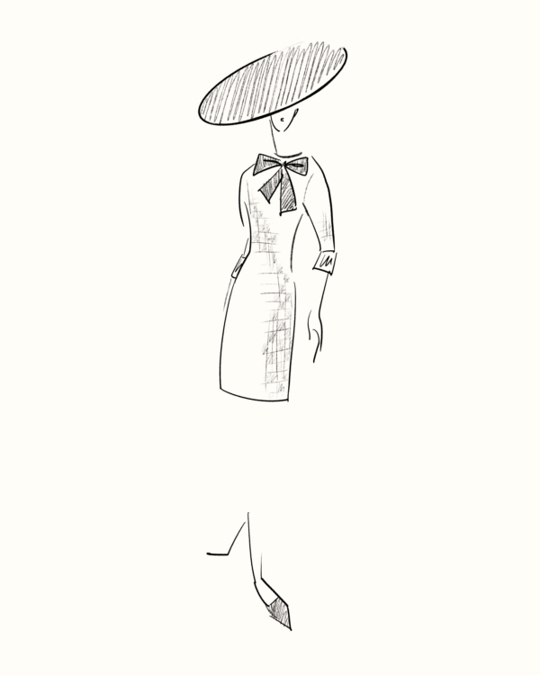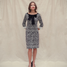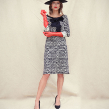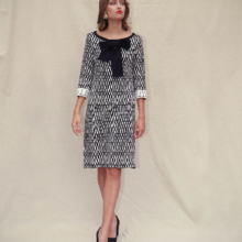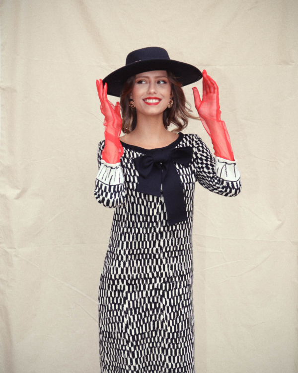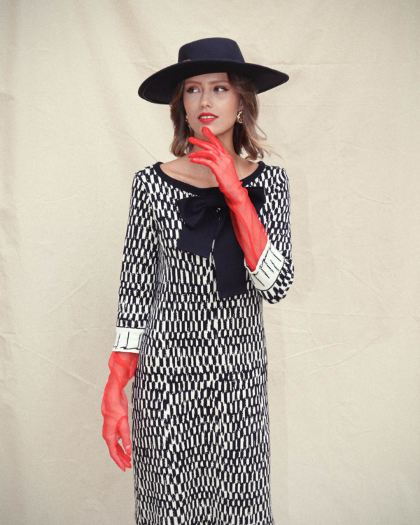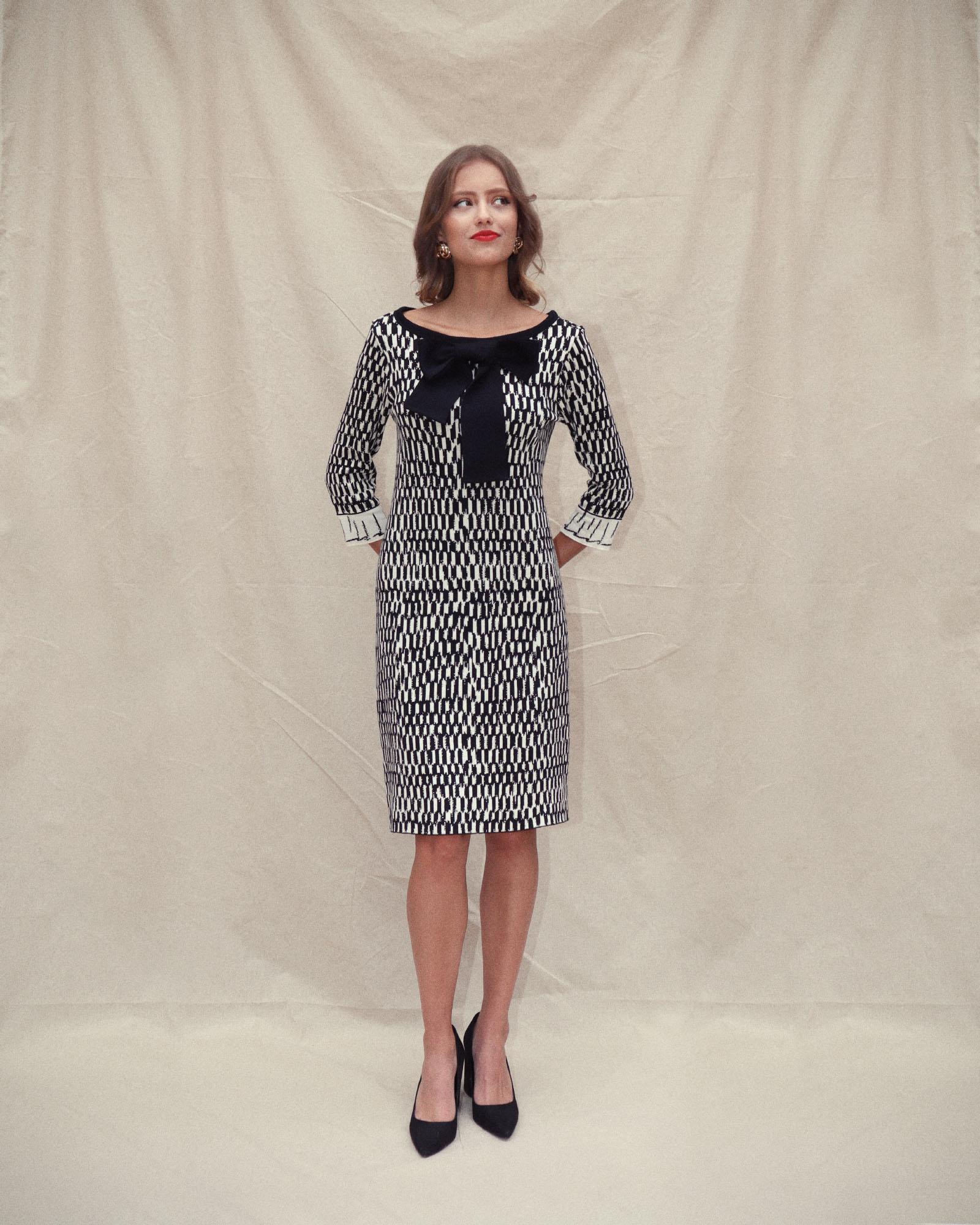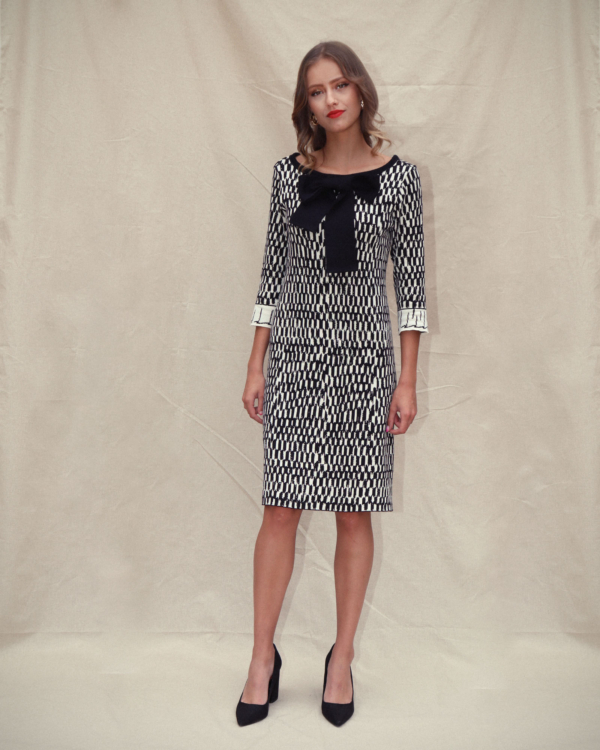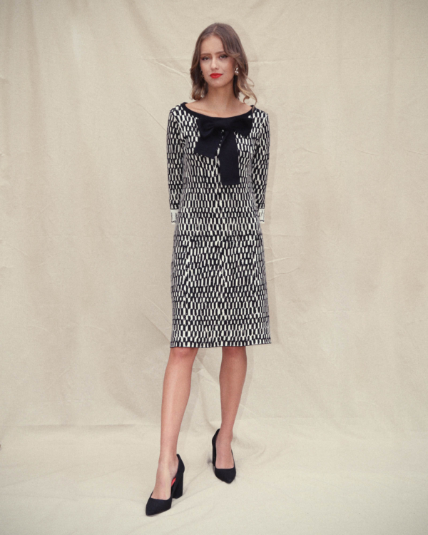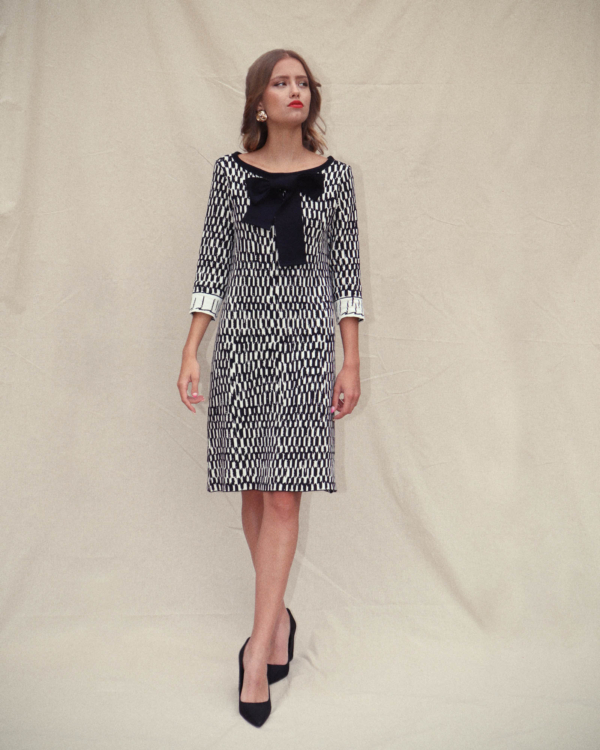 Ontdek de rechte jurk Vivienne. Vivienne heeft een ingebreid grafisch dessin van een handgetekende zwart-witte ruit, alsof het handgeweven blokjes zijn. De manchetten zijn voorzien van een trompe-l’oeil van geplooide stof. De eyecatcher is de strik! Dit ontwerp is minder getailleerd dan een kokerjurk.